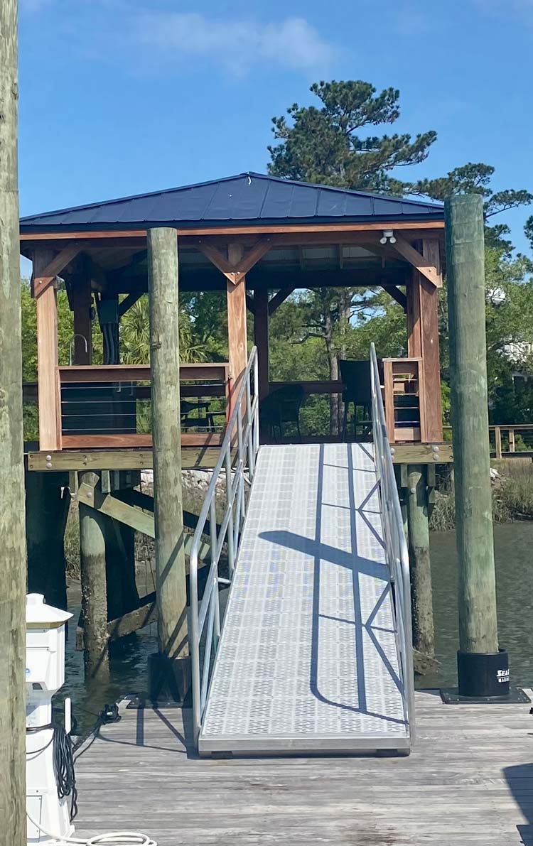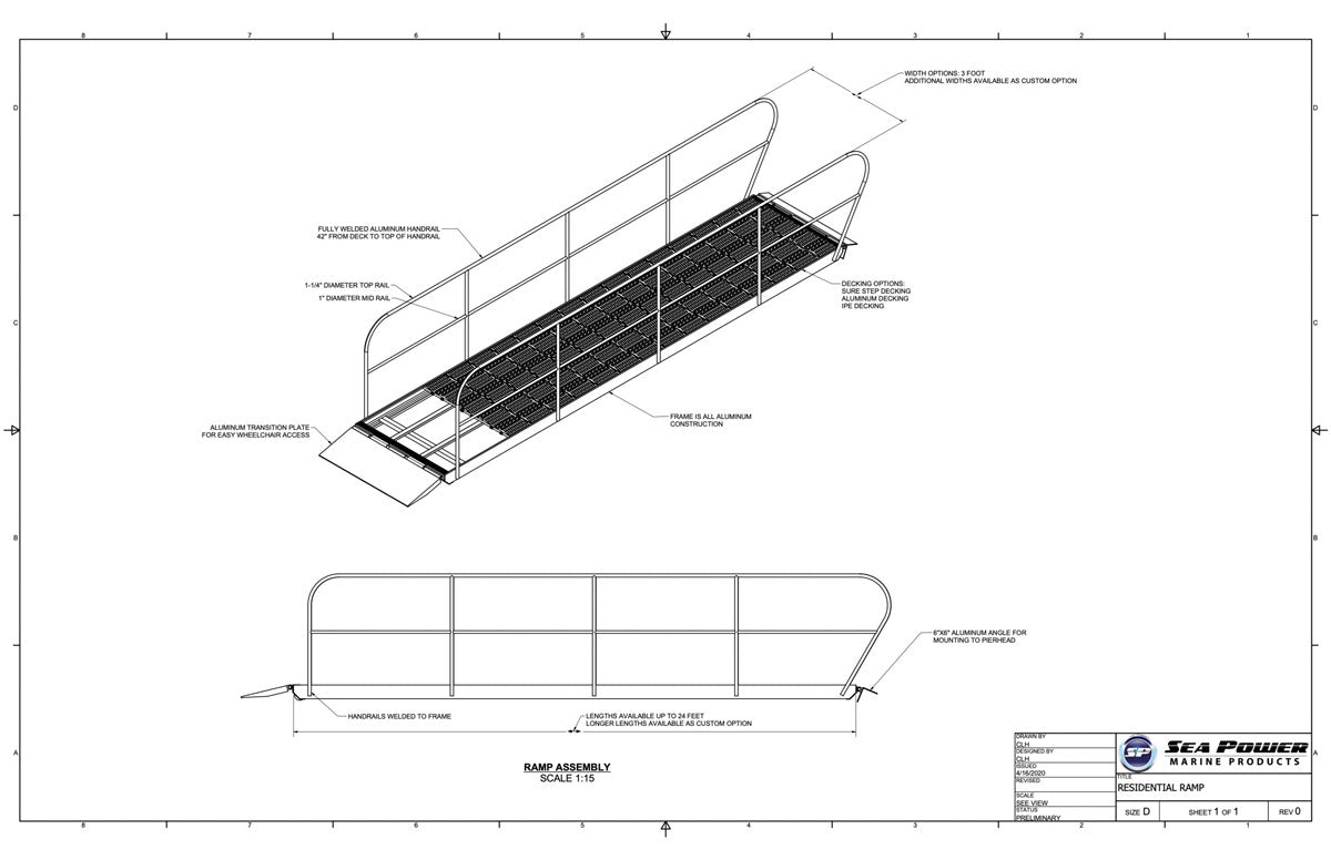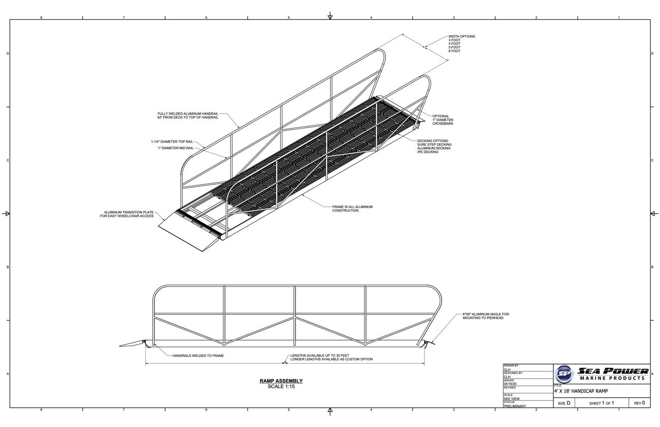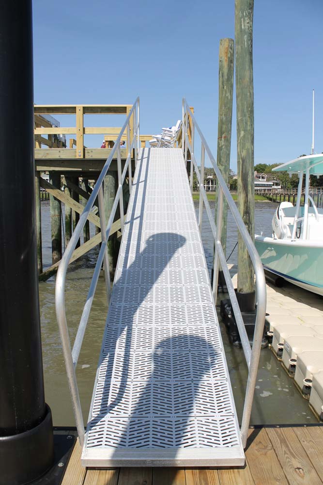 Sea Power fabricates commercial and residential aluminum dock ramps and gangways in a variety of sizes and configurations. Commercial grade aluminum is used in all of Sea Power’s ramps and gangways, with particular attention paid to all welds, joints and hinges. The ramps are available in lengths from 16 feet to 24 feet, and widths of 3 or 4 feet. Special sizes can be fabricated for unique needs. Ramp decking is available in aluminum or Sure-Step polypropylene.
